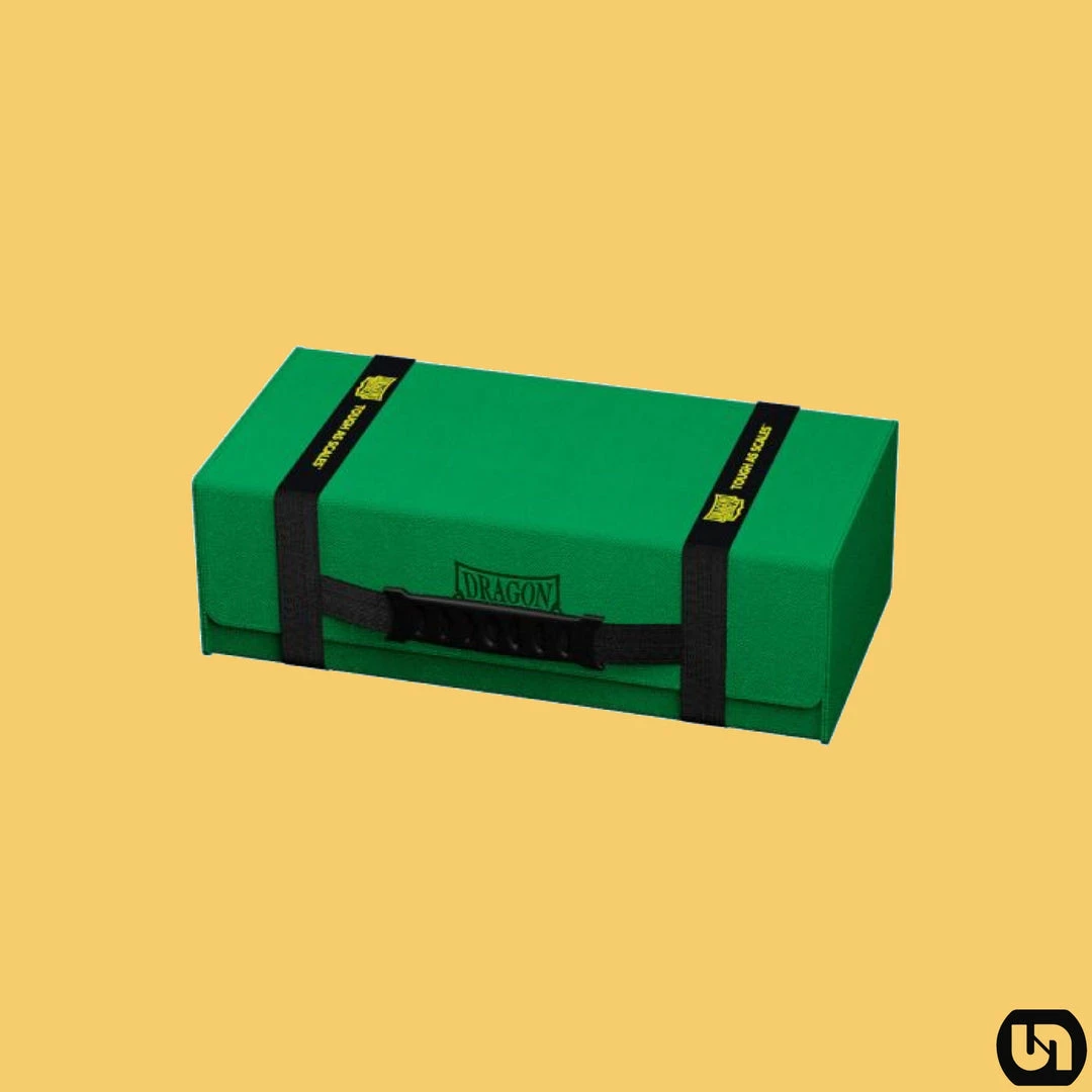 Fierce Green exterior and deep Black interior. Dragon Shield Magic Carpet XL is a combined storage box and playmat that offers an easy and elegant way to store and transport lots of cards. It features an exclusive tough ‘Dragon Skin’ exterior and a smooth satin lined interior combined with a strong magnetic seal to keep cards safe.