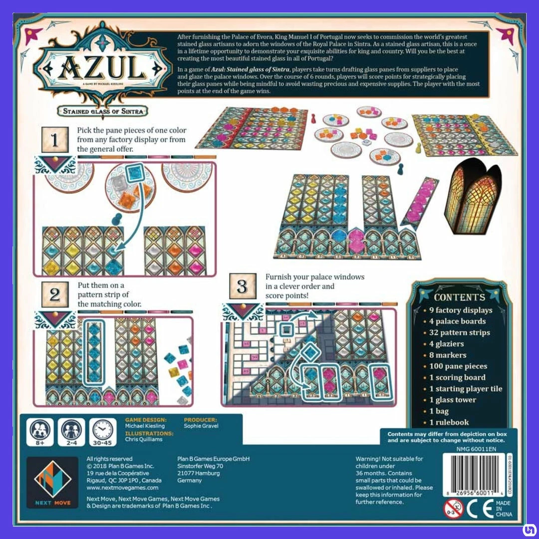 Created by Michael Kiesling, Azul: Stained Glass of Sintra challenges players to carefully select glass panes to complete their windows while being careful not to damage or waste supplies in the process. The window panels are double-sided, providing players with a dynamic player board that affords nearly infinite variability!