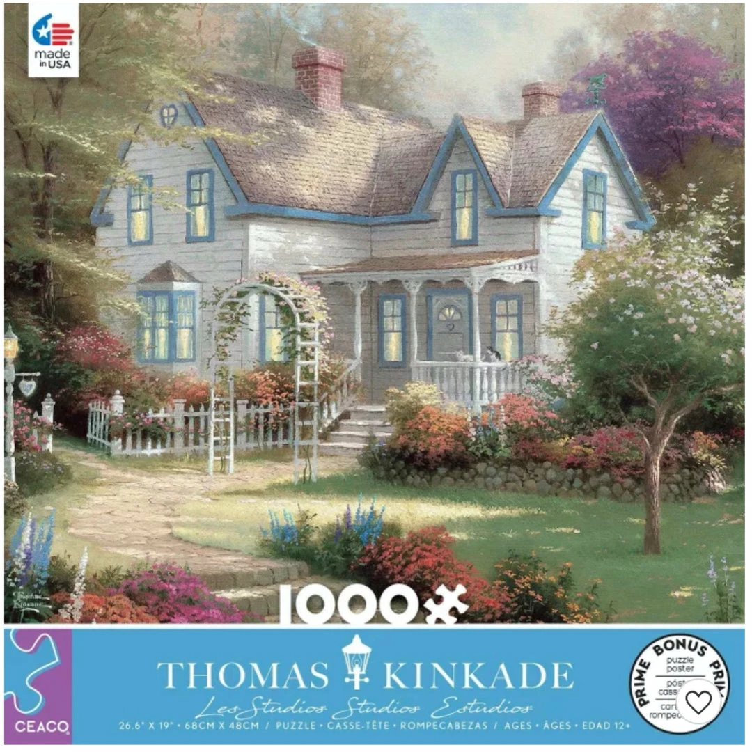 This 1000 piece puzzle of the Thomas Kinkade painting, Home Is Where the Heart Is 2, features a classic white clapboard farmhouse surounded by a lovely garden and a flowering apple tree. Bonus poster of the puzzle image is included! Count on Ceaco for the most Creative, Exciting, and Colorful puzzles since 1987.