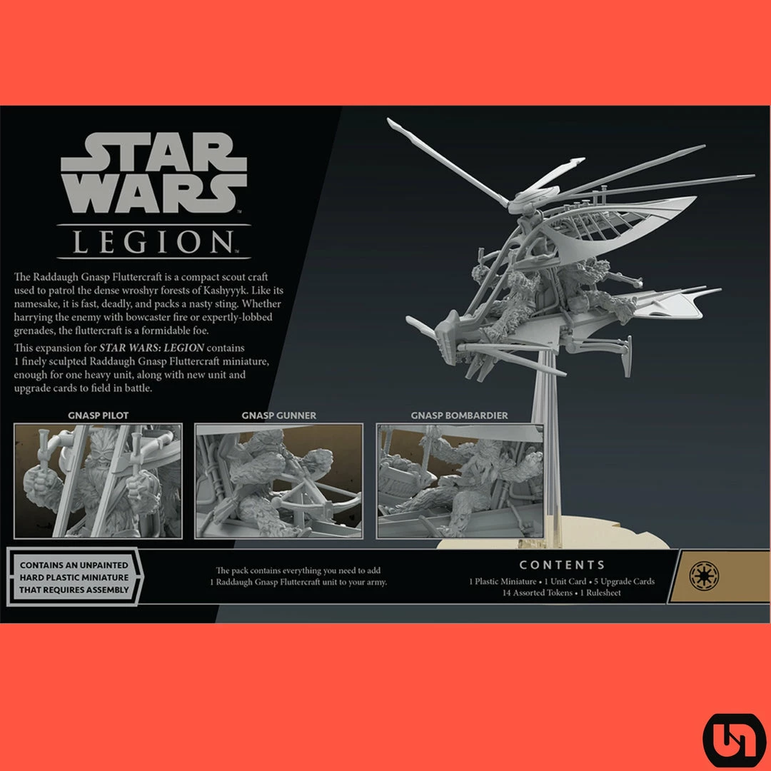 Β Within this expansion, youβll find everything you need to add a Raddaugh Gnasp Fluttercraft to your Republic armies as a support unit. A beautifully detailed, unpainted hard plastic miniature brings this unit to life on your tabletop, while a unit card outlines all of its capabilities, including the new Overrun keyword. Finally, five upgrade cards invite you to choose exactly how this unit behaves in combat.