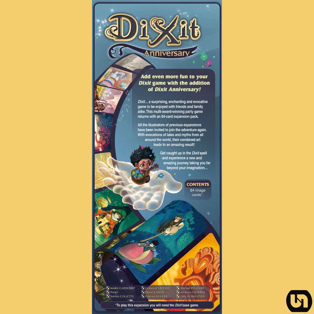 Have even more fun with the addition of Dixit Anniversary, an 84 card expansion pack celebrating 10 years of Dixit. All the illustrators of previous expansions have been invited to join the adventure again. With evocations of tales and myths from all around the world, their combined art leads to an amazing result! Get caught up in the Dixit spell and experience a new and amazing journey taking you far beyond your imagination.
