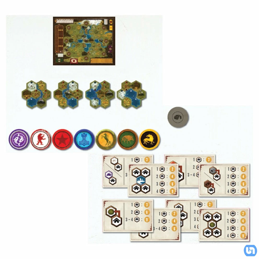 - 4 double-sided tiles (7 hexes per tile)