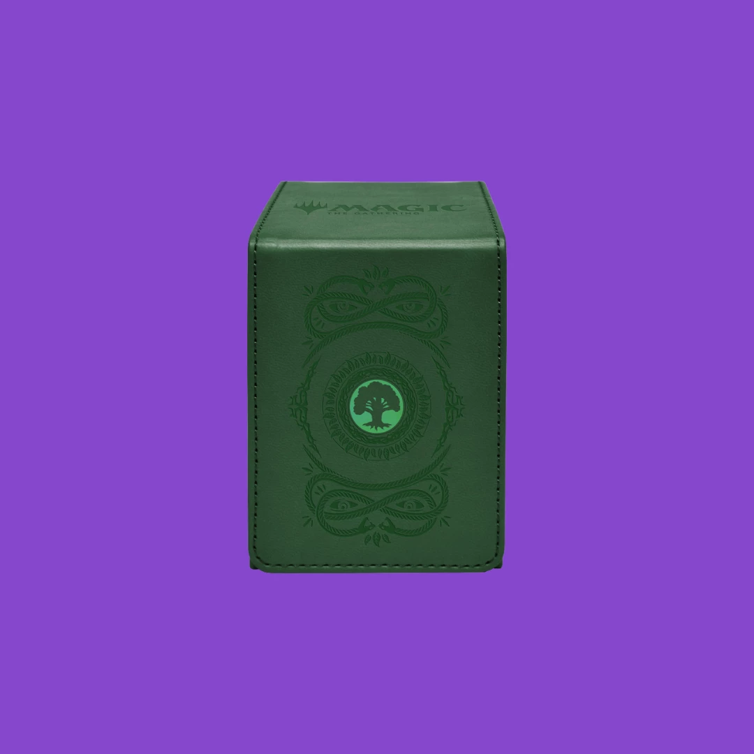 The Alcove Flip Deck Box for Magic: The Gathering features a vibrant, full-color leatherette finish with a stylized debossed design and spot mirror foil accents. The strong magnetic closure provides secure storage while the dual thumb notches allow for easy access to your deck. This deck box holds up to 100 standard size trading cards double-sleeved in Ultra PRO Deck Protector sleeves.