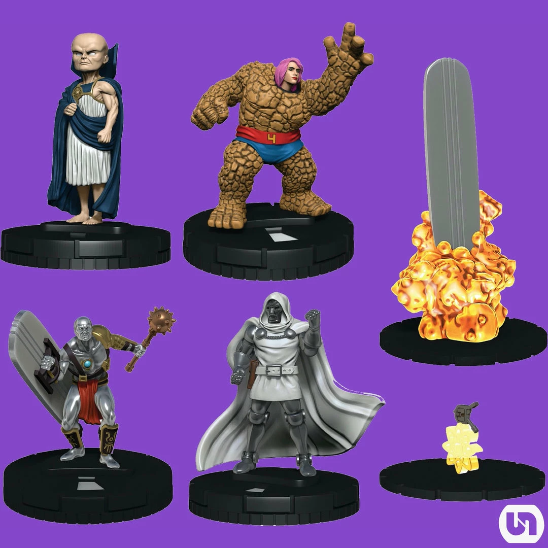 Every booster will come with 5 pre-painted figures and select boosters will come with a bonus equipment-objects like Doom’s Time Platform or Diablo’s Alchemical Potions to use on your HeroClix team!